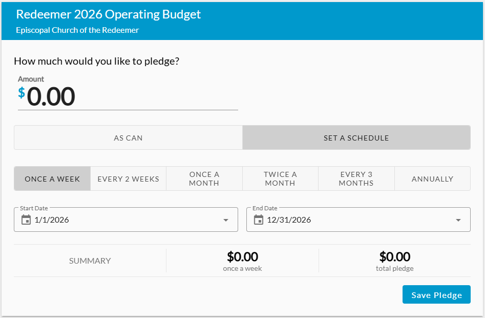 Redeemer welcomes all contributions, but Intentions to Give help us plan ahead more accurately. Regular gifts (automated gifts given weekly or monthly) help stabilize the cash flow.